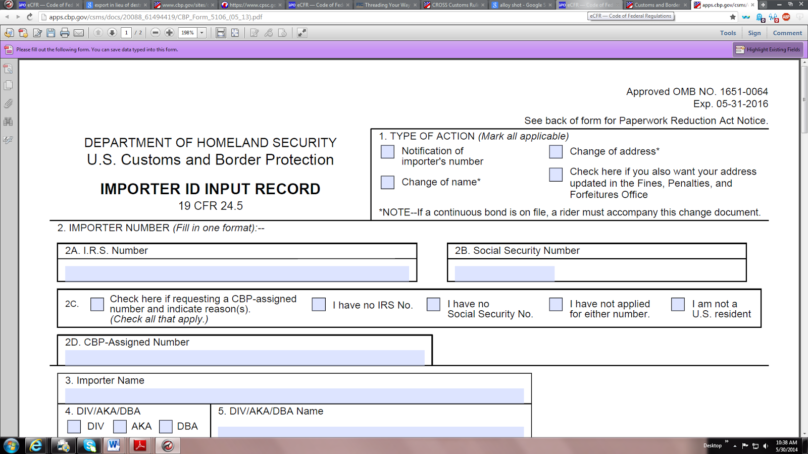Effective July 1, 2014, the new versions of both the Customs Bond form (Form 301) and the Importer ID Input Record form (Form 5106) will be mandatory and any other version will not be accepted.
